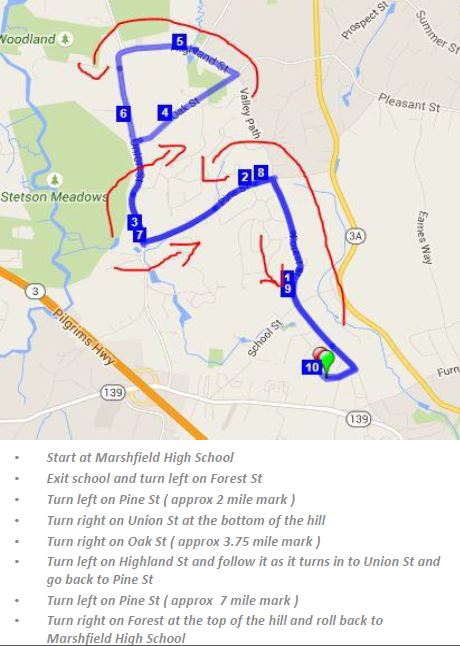 Parking will be available at The Marshfield High School. A registration table and race day number pick up will be located adjacent to the Marshfield Ram near the front entrance of the school.